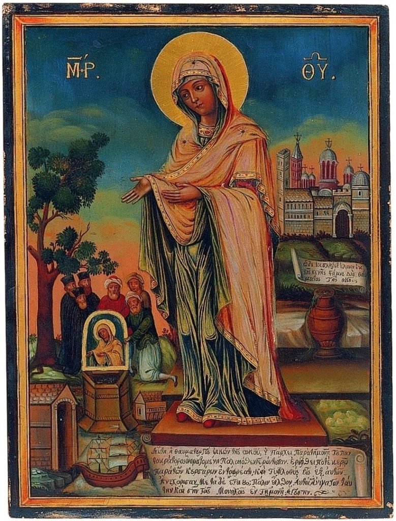 На иконе изображена Богоматерь во весь рост. Причем это одна из редких икон на которой она изображена одна без младенца.  Ее руки протянуты молитве. У ног святой стоит кувшин, который наполнен елеем.  Облик святой никого не оставляет равнодушным.  Она у каждого верующего вызывает чувство радости, мира и душевного покоя. С данной иконой связанна одна легенда. Однажды в 17 веке в Афонском монастыре был сильный голод.